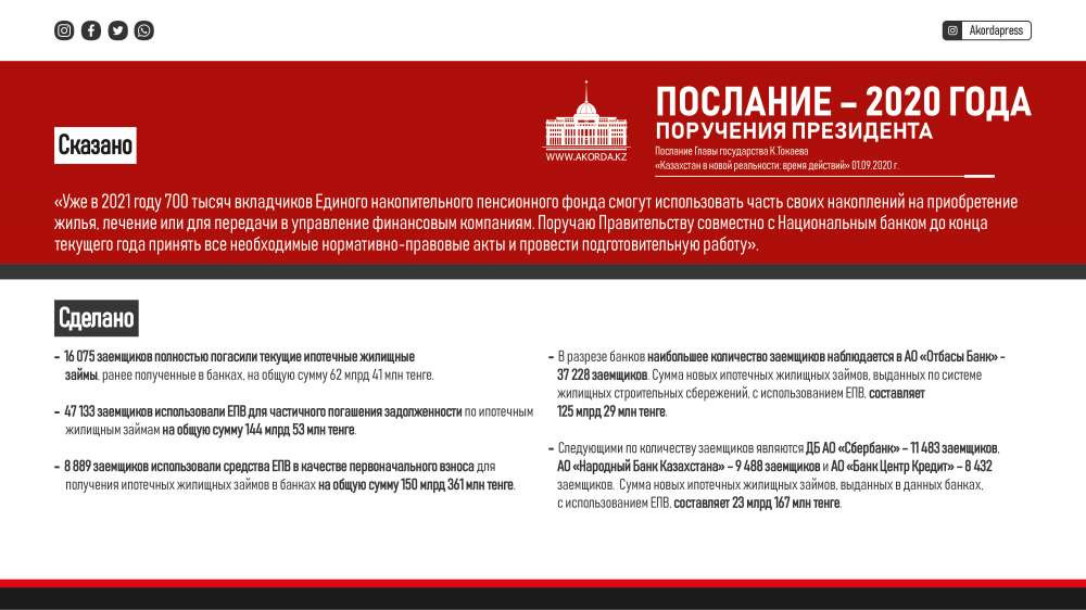 "47 133 заемщиков использовали ЕПВ для частичного погашения задолженности по ипотечным жилищным займам на общую сумму 144 миллиарда 53 миллиона тенге. 8 889 заемщиков использовали средства ЕПВ в качестве первоначального взноса для получения ипотечных жилищных займов в банках на общую сумму 150 миллиардов 361 миллион тенге", - говорится в публикации.