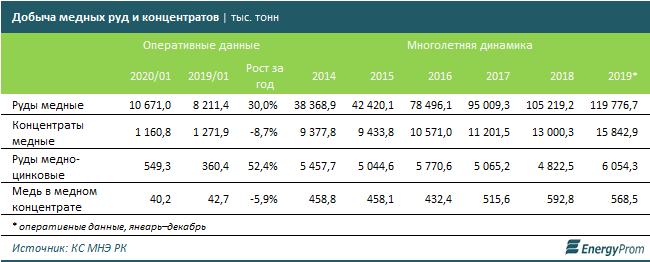 В январе 2020 года в Казахстане добыли 10,7 миллиона тонн медных руд — на 30 процентов больше, чем в январе 2019-го. Добыча медно-цинковых руд достигла уже 549,3 тысячи тонн — плюс 52,4 процента к прошлому году. Медных концентратов добыли 1,16 миллиона тонн (минус 8,7 процента за год), меди в медном концентрате — 40,2 тысячи тонн (минус 5,9 процента).
