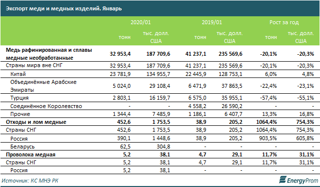 В первом месяце 2020 года Казахстан отправил на экспорт 32,95 тысячи тонн необработанной рафинированной меди и медных сплавов на сумму 187,7 миллиона долларов; медных отходов и лома — 452,6 тонны на 1,75 миллиона долларов; медной проволоки — 5,2 тонны на 38,1 тысячи долларов.