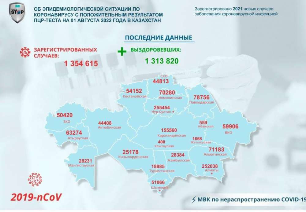 За прошедшие сутки в Казахстане зарегистрирован 2021 новый случай заболевания коронавирусной инфекцией, передаёт BaigeNews.kz со ссылкой на МВК по нераспространению Covid-19.