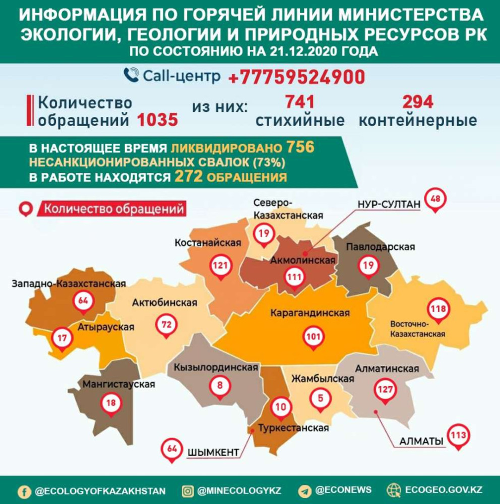 Напомним, 17 июля 2020 года по поручению Главы государства Министерством экологии, геологии и природных ресурсов РК создана горячая линия для сбора обращений граждан по несанкционированным свалкам в стране. Так, сообщить о нарушениях можно по номеру +77759524900.