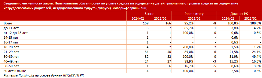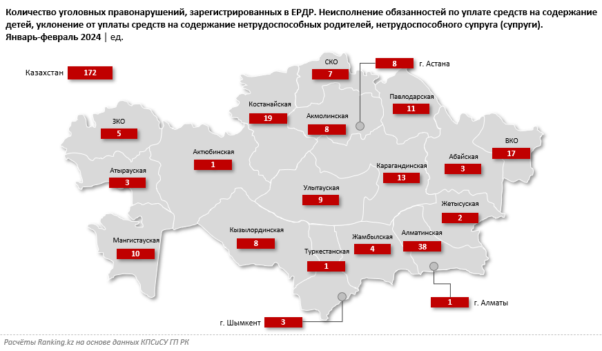 За январь-февраль текущего года в Едином реестре досудебных расследований РК зарегистрировали 172 уголовных правонарушения по статье 139 УК РК "Неисполнение обязанностей по уплате средств на содержание детей, уклонение от уплаты средств на содержание нетрудоспособных родителей, нетрудоспособного супруга (супруги)", передаёт BaigeNews со ссылкой на ranking.kz. Это на 1,1% меньше, чем годом ранее.