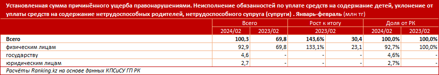 Установленная сумма ущерба, причинённого правонарушениями по неуплате средств на содержания детей, нетрудоспособных родителей и супругов, по итогам января-февраля текущего года составила 100,3 млн тг, на 43,6% больше, чем годом ранее.