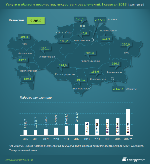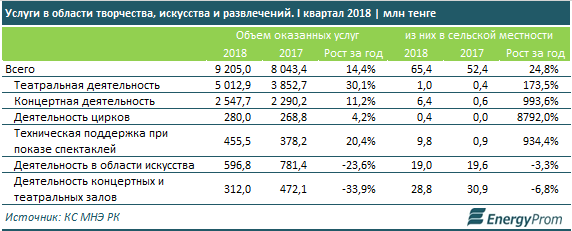 По итогам I квартала текущего года казахстанцам было оказано услуг в сфере творчества, искусства и развлечений на 9,2 миллиарда тенге - это на 14,4% больше, чем годом ранее, передаёт BNews.kz со ссылкой на исследования energyprom.kz.