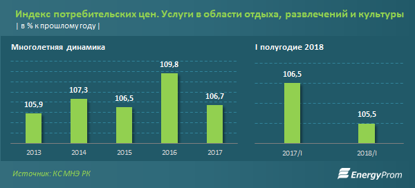 По итогам I полугодия 2018 стоимость услуг в сфере культуры, развлечений и отдыха поднялась на 5,5% к январю-июню годом ранее, при показателе инфляции в соответствующем периоде - 6,4%.