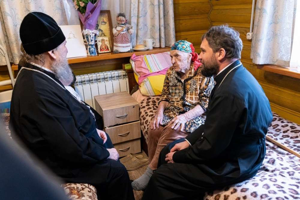 Свой 102-й день рождения Едвокия Александровна начала с посещения храма, где проводил службу митрополит Астанайский и Казахстанский Александр, приехавший лично поздравить именинницу.