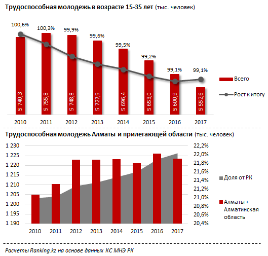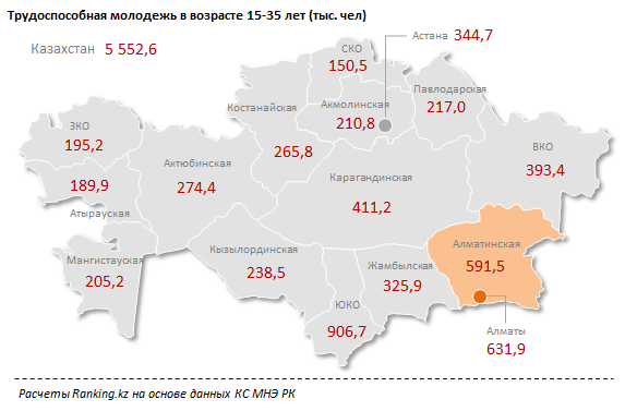 К началу текущего 2017 года в Казахстане насчитывалось 5,55 млн молодых людей трудоспособного возраста (от 15 до 35 лет). Из них более одной пятой пришлось на Алматы и Алматинскую область (1,22 млн чел.).