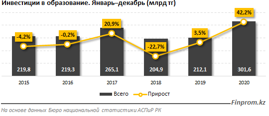 Развитию человеческого капитала в Казахстане не первый год уделяют все больше внимания. Так, инвестиции, направленные в сферу образования, увеличились на 42,2 процента за год и составили 301,6 миллиарда тенге, или 2,4 процента от общей суммы капвложений в стране.