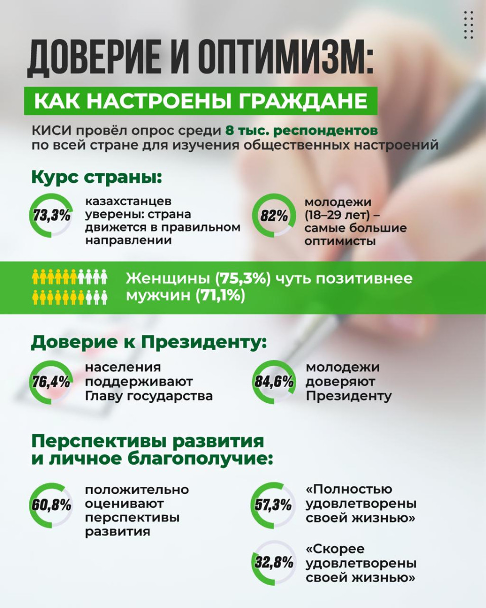 Согласно последнему опросу, проведенному по заказу Казахстанского института стратегических исследований, 73,3% граждан уверены, что Казахстан развивается в правильном направлении, передаёт BaigeNews.kz. Это исследование, проведенное с 20 марта по 20 апреля 2025 года, охватило более 8 тысяч респондентов по всей стране, включая 17 областей и 3 города республиканского значения.