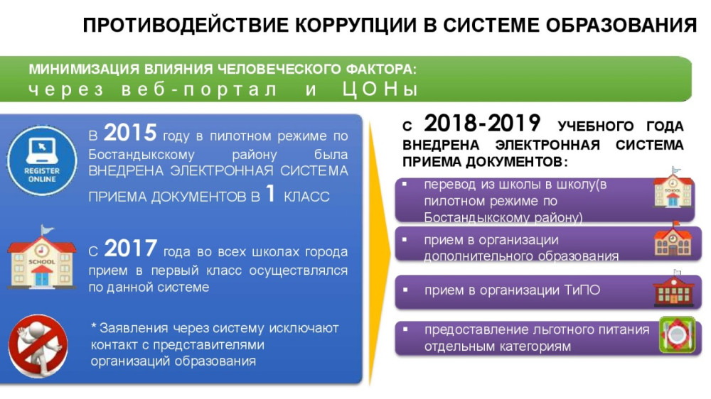 В антикоррупционных целях Управлением образования была разработана электронная система приема документов. С 2015 года все организации образования на своих сайтах и на сайте УО размещают отчет о доходах и расходах бюджетных средств.