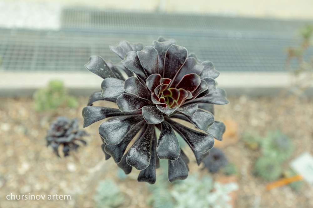 Растет здесь и весьма необычный суккулент, который по форме похож на цветок. Называется он Эониум, в простонародье известный как черная роза.