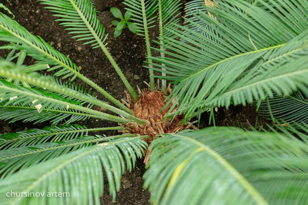 "Цикас или саговник поникающий — растение, которое считается ровесником динозавров. Это представитель древних растений в оранжерее Ботанического сада. Каждый год у него появляется новая мутовка, т.е. пучок листьев. Если посчитать мутовки, по ним можно определить возраст растений", — говорит Гуль-Гуль Жаксылыковна.