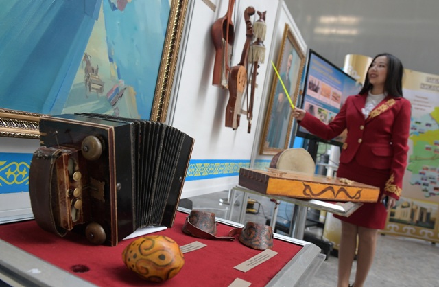 На экспозиции, посвященной модернизации сознания, можно было увидеть гармонь-тальянку Майры Шамсутдиновой и складную домбру времен XIX века.