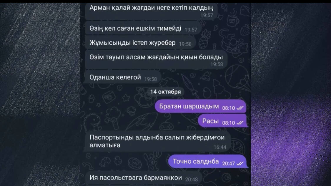 Также женщина добавила, что ей скинули переписку её брата с неизвестным, который угрожал молодому человеку и требовал самостоятельно вернуться в Шымкент.