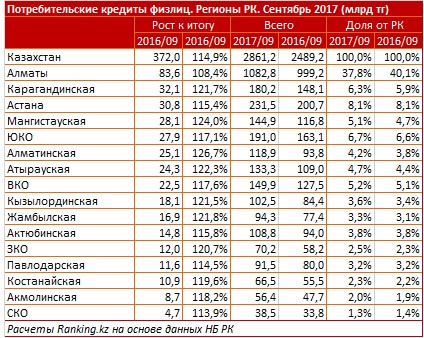 Все 16 регионов Казахстана за год нарастили объем потребительских кредитов. Лидирует по годовому приросту Алматы - на 83,6 млрд тенге (8,4%), до 1,1 трлн тенге. Доля от Казахстана уменьшилась с 40,1% до 37,8%. По объему потребительских кредитов Алматы на первом месте.