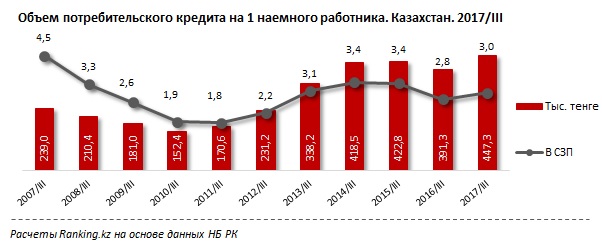 Уровень потребительской закредитованности за год к концу третьего квартала 2017 года вырос на 14,3% (56 тыс тенге) и составил 447,3 тыс тенге на одного наемного работника. Объем потребительской задолженности одного наемного работника перед банком составил три среднемесячных заработных плат (СЗП), годом ранее - 2,8 СЗП.