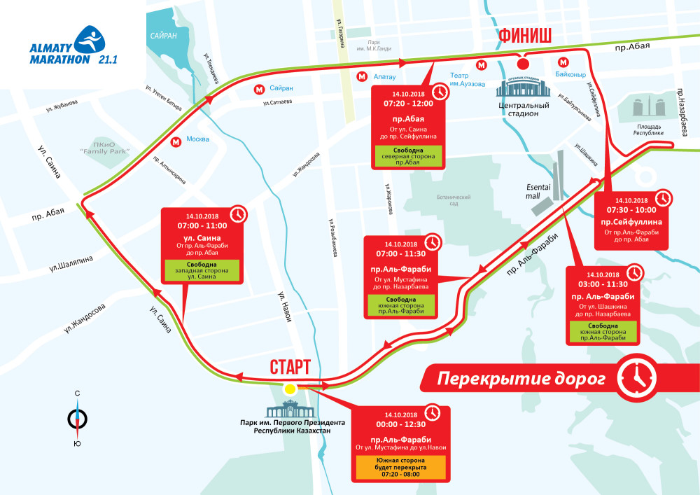 Движение по проспект Сейфуллина от пр. Аль-Фараби до проспекта Абая будет закрыто с 07:30 до 10:00. Все полосы движения будут полностью перекрыты. Проспект Абая от ул. Саина до проспекта Сейфуллина будет перекрыт с 07:20 до 12:00. Северная сторона будет свободна для автотранспорта. Улица Саина от проспекта Аль-Фараби до проспекта Абая будет закрыта с 07:00 до 11:00. Западная сторона будет свободна для движения автотранспорта. Данные внесены с учетом рационального распределения времени движения участников забега.