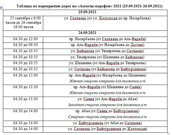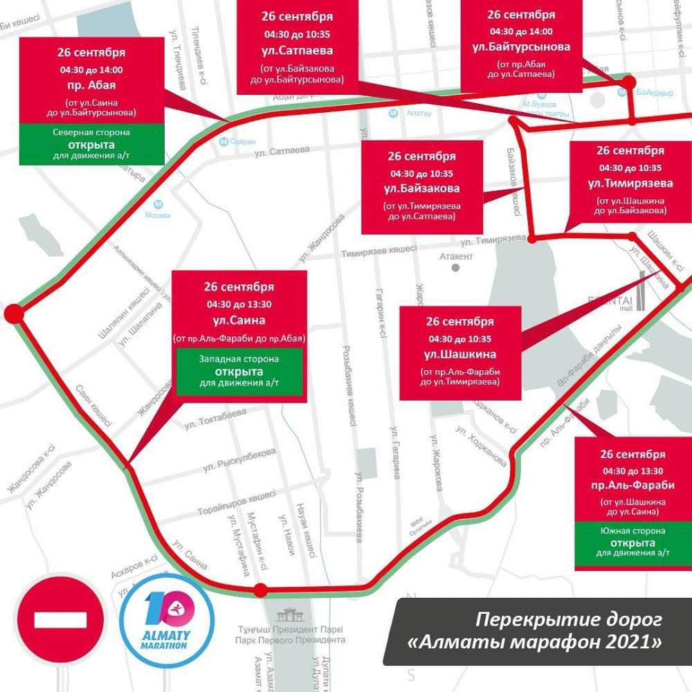 Старт и финиш марафона пройдет на Площади Республики, поэтому по улице Сатпаева от улицы Желтоксан до проспекта Назарбаева будут перекрыты обе полосы движения с 6:00 часов 25 сентября до 18:00 часов 26 сентября.