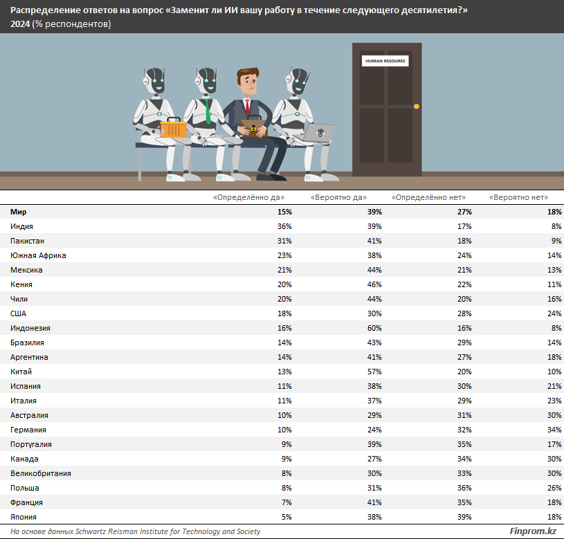 Однако внедрение ИИ вызывает и тревогу — многие опасаются потерять работу из-за автоматизации. Это не только казахстанская проблема, а общемировая тенденция, показал международный опрос, проведённый Schwartz Reisman Institute при Университете Торонто.