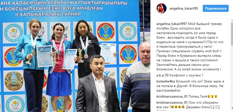 Трехкратная чемпионка Казахстана по боксу 20-летняя Ангелина Лукас обвинила своего бывшего тренера Ерика Алгабек в попытке сорвать бой. Об этом девушка написала на своей странице в Instagram. По словам спортсменки, Ерик набросился на нее с кулаками, когда она была одна.