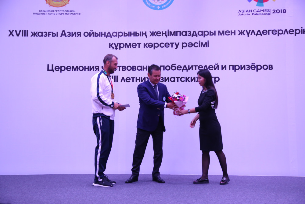Цветы и конверт с премиальными в знак благодарности вручили казахстанским звездам главных спортивных игр лета в Индонезии. Согласно Постановлению Правительства Республики Казахстан чемпионам и призерам вручили премиальные выплаты за высокие достижения на Азиаде-2018 в размере 10 тыс долларов – "золото", пять тыс долларов – "серебро" и три тыс – "бронза". Также премии получили наставники отличившихся спортсменов.