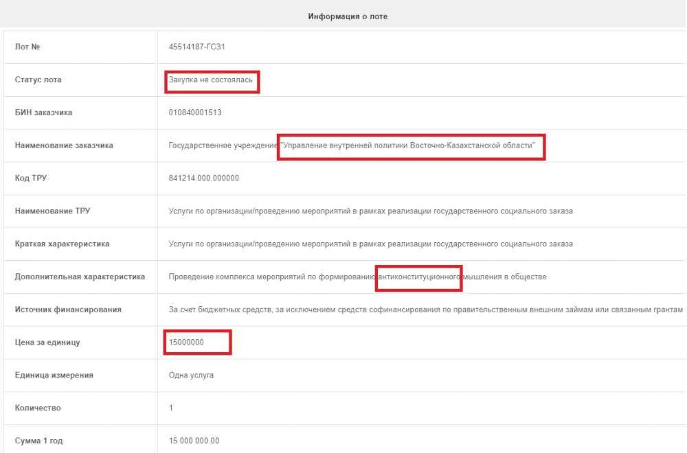 На сайте госзакупок сообщается, что одна услуга по "формированию антиконституционного мышления" оценивается в 15 миллионов тенге. При этом, указано, что деньги будут выделены из бюджетных средств.