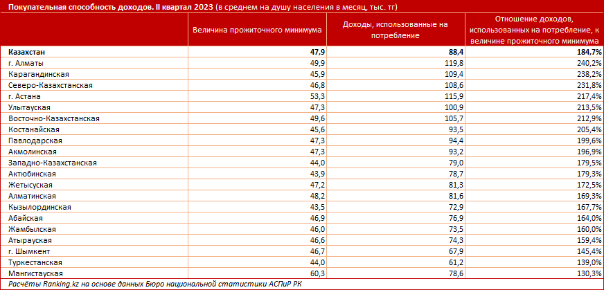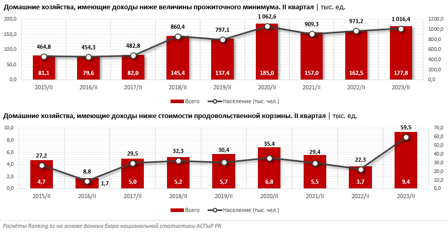 Ranking.kz представил отчёт по итогам второго квартала 2023 года, согласно которому в Казахстане насчитывается 177 800 домашних хозяйств, имеющих доходы ниже прожиточного минимума. Это на 9,4% больше, чем годом ранее и 5,1% от всех домохозяйств республики. В семьях с доходом ниже прожиточного минимума проживает около одного миллиона человек.