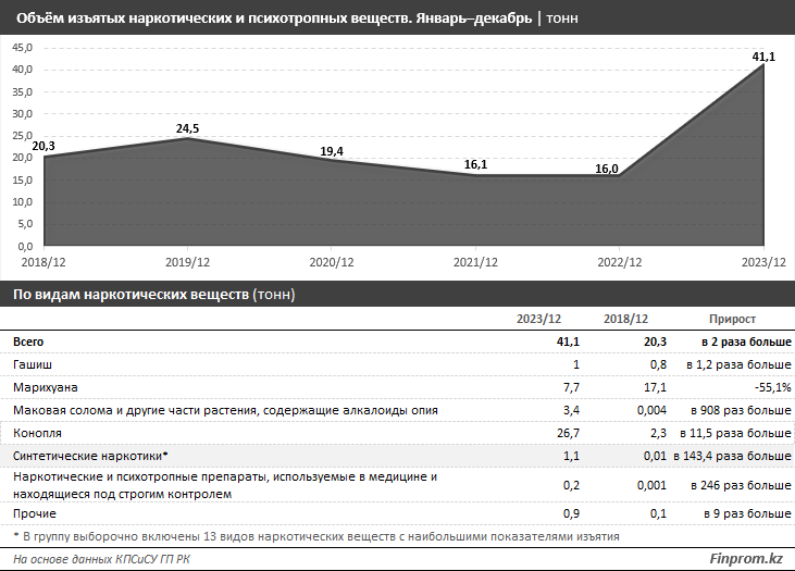 Объём изъятия наркотических средств в Казахстане за последние несколько лет вырос в два раза, передаёт BaigeNews со ссылкой на Finprom. Если в 2018 году сотрудники правоохранительных органов обнаружили и конфисковали 20,3 тонны опасных веществ, то по итогам прошлого года цифра увеличилась до 41,1 тонны. Судя по отчётам Комитета правовой статистики и специальных учётов Генпрокуратуры РК (КПСиСУ ГП), это максимальный показатель за пятилетний период. Количество ликвидированных нарколабораторий только за прошедший год выросло с 68 до 75. Депутаты сената ситуацию с распространением запрещённых наркотических веществ назвали вспышкой наркоторговли и предложили создать отдельную госструктуру, которая бы занималась исключительно этой проблемой.