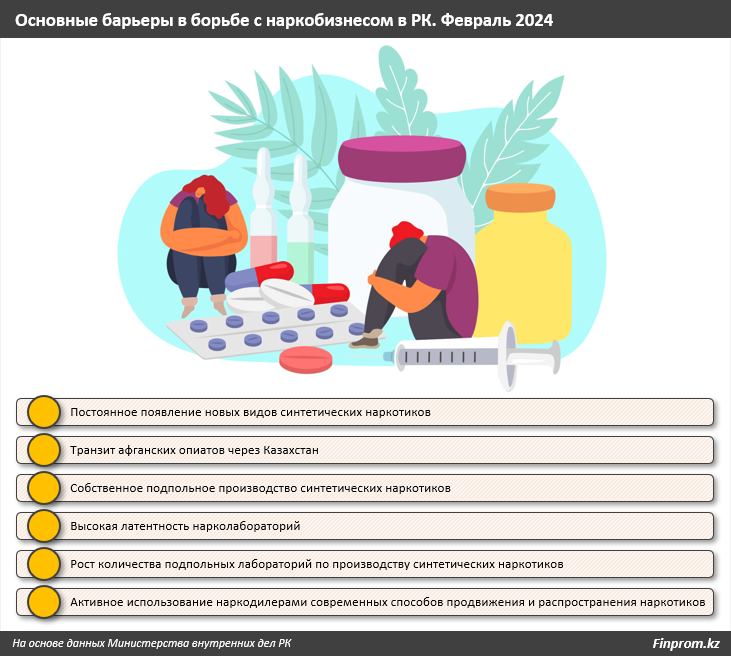 Одна из многочисленных, и, пожалуй, самых быстрорастущих проблем наркотрафика в Казахстане — форсированное распространение среди молодёжи легкодоступных синтетических наркотиков. Количество их видов растёт так быстро, что МВД добилось права включать новые варианты "синтетики" в национальный список наркосредств ещё до их появления в стране, сразу после регистрации наркотика в перечнях ЕАЭС или Международного комитета ООН. Если до 2019 года включение нового наркотика в национальный список длилось около года, то теперь срок сокращён до месяца. Объём конфискации всяческих "солей", "экстази" и других синтетических каннабиноидов за последние несколько лет в РК вырос в 143,4 раза, с 7,7 кг до 1,1 тонны.