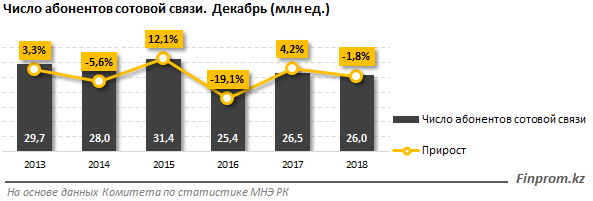 По итогам 2018 года число абонентов сотовой связи составило 26 млн человек, c незначительным снижением за год на 1,8%, пишет Finprom.kz. Количество абонентов, имеющих доступ к интернету, увеличилось на 4,2% и достигло 14,4 млн человек.