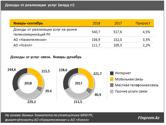 За 2018 год доходы телекоммуникационного сектора составили 728,7 млрд тенг, увеличившись на 3,7%, чем годом ранее (702,8 млрд тенге). Основную долю в структуре доходов занимают интернет-услуги: 33,6%, или 244,6 млрд тенге; годовой прирост составил 7%. В ТОП-3 также вошли мобильная связь (29,6%, 215,5 млрд тенге) и местная телефонная связь (5,4%, 39,4 млрд тенге). Доходы от услуг интернета и мобильной связи в совокупности занимают 63,1% от всего телекоммуникационного рынка.