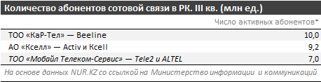 По итогам третьего квартала 2018 года лидером по количеству абонентов сотовой связи стал Beeline: 10 млн единиц. Это максимальное значение за всю историю компании. На втором месте оказалось АО «Кселл»: 9,2 млн абонентов. Замыкают список объединённые Tele2 и ALTEL: 7 млн абонентов.