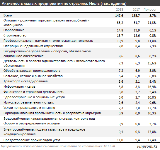 Количество активных малых предприятий на конец июля 2018 года достигло 147,6 тыс, что превышает прошлогоднее количество на 8,7 % или 11,8 тыс предприятий.
