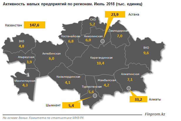 Следом за южной столицей идёт Астана - 23,9 тыс малых компаний (годом ранее - 16,3 тыс). Замыкает тройку лидеров Карагандинская область - 10,4 тыс активных предприятий, как и годом ранее.