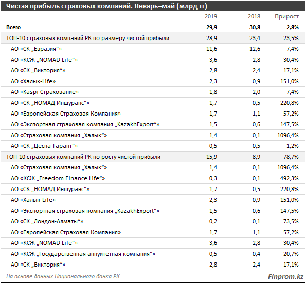 Чистая прибыль страховых организаций снизилась на 2,8% к аналогичному периоду годом ранее и составила всего 29,9 млрд тг. Для сравнения: за аналогичный период 2018 года чистая прибыль достигла 30,8 млрд тг, увеличившись за год сразу в 2,6 раза.