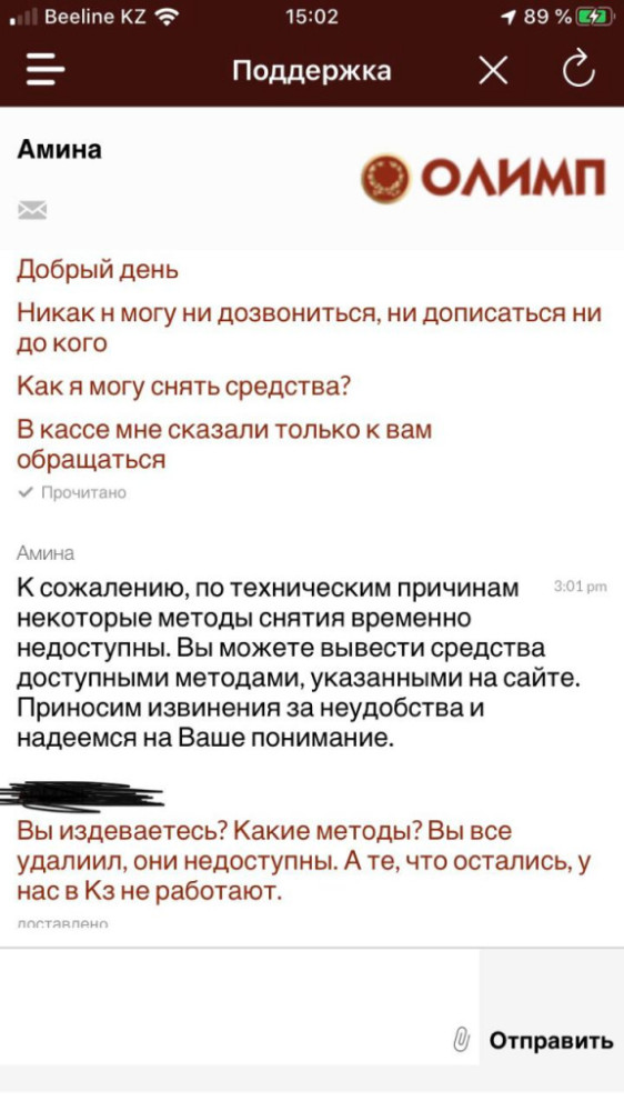 С вопросами о том, что изменилось в конторе после решения суда о приостановке деятельности и как сейчас производятся выплаты клиентам, корреспондент BaigeNews.kz обратился в одно из отделений "Олимпа", но там проигнорировали вопрос и в целом были весьма нелюбезны с журналистом. В другом отделении сотрудники оказались сговорчивее: