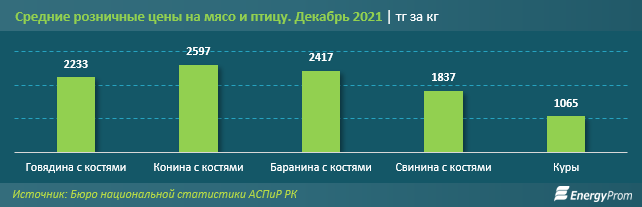 Следом идут баранина (2417 тенге за килограмм) и говядина (2233 тенге за килограмм). Свинина обойдется в 1837 тенге за килограмм, а куры — в 1065 тенге а килограмм.
