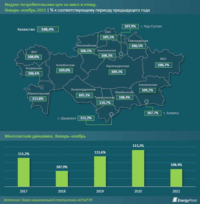 Среди регионов Казахстана самый заметный рост был зафиксирован в Мангистауской области (на 13,8%), Шымкенте (на 11,2%) и Туркестанской области (на 10,7%).
