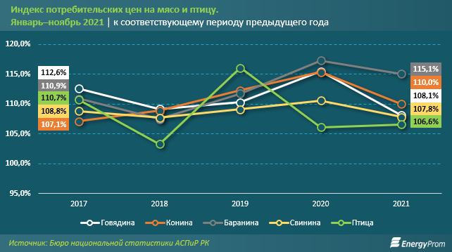 Цены на мясо и птицу за неполный 2021 год выросли на 8,4% по сравнению с январем–ноябрем 2020 года. Годом ранее за аналогичный период цены поднялись на 13,2%.