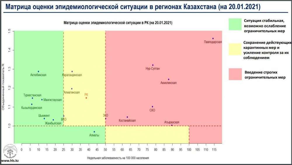 Отметим, за сутки Восточно-Казахстанская область переместилась из "зеленой зоны" в "желтую". А Западно-Казахстанская область оказалась на границе "красной зоны"