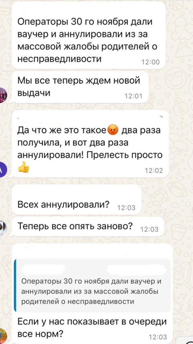 "29 ноября начался набор, но я не смогла зайти на сайт. Он отображался как заблокированный. Некоторые всё же смогли зарегистрироваться, но позже их ваучеры аннулировали. Жалоб в чате было очень много", — рассказала Гаухар.