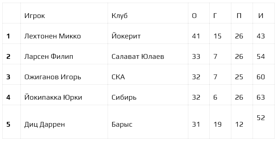 Среди защитников лучшим по результативности стал Микко Лехтонен из "Йокерита". В прошлом сезоне он стал лучшим защитником сезона, а в этом году уже в ноябре покинул клуб и отправился в Канаду. Лехтонен показал феноменальную результативность – 41 очко в 43 матчах. Ближе всех к финну подобрался датчанин Филип Ларсен (33 очка), в пятерку также вошли Игорь Ожиганов и Юрки Йокипакка (по 32). Лучший снайпер-защитник года Даррен Диц расположился на пятом месте.