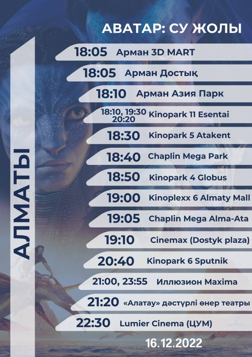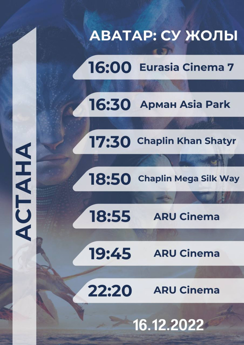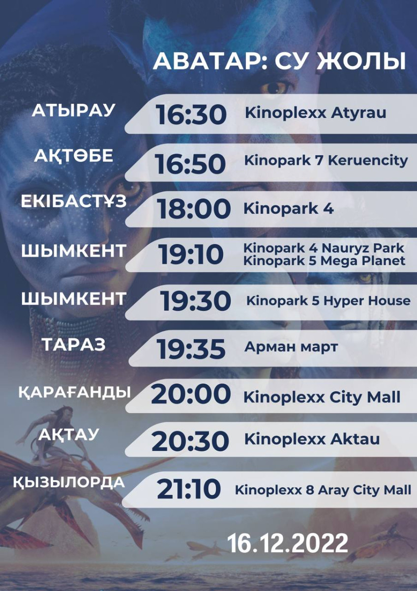 "Министерство культуры и спорта совместно с Disney Studio выступило с инициативой дать гражданам возможность посмотреть фильм "Аватар: Путь воды" на казахском языке. Новый блокбастер дублировали и передали во все кинотеатры. Очевидно, что кинотеатры — это субъект предпринимательства. Как бы там ни было, предлагаем вам список кинотеатров и кинотеатров, которые выставили фильм по запросу, поддерживая казахский Приглашаю посетить казахский вариант "Аватара", — написал Даурен Абаев.