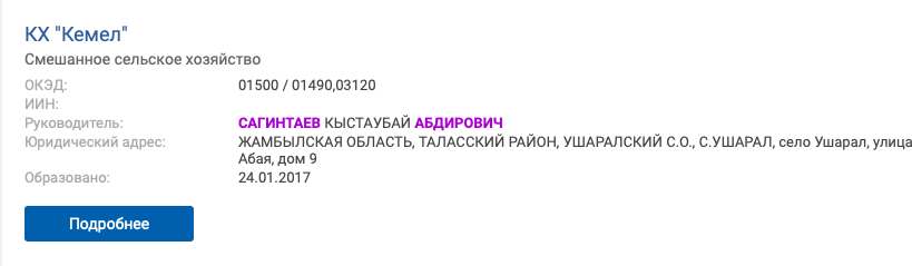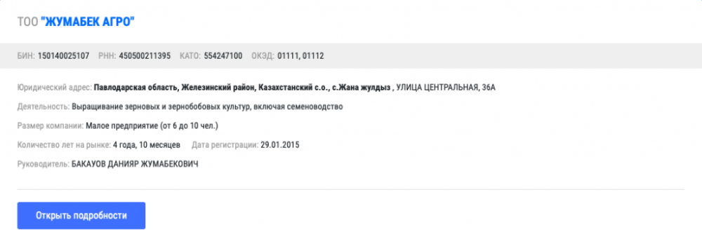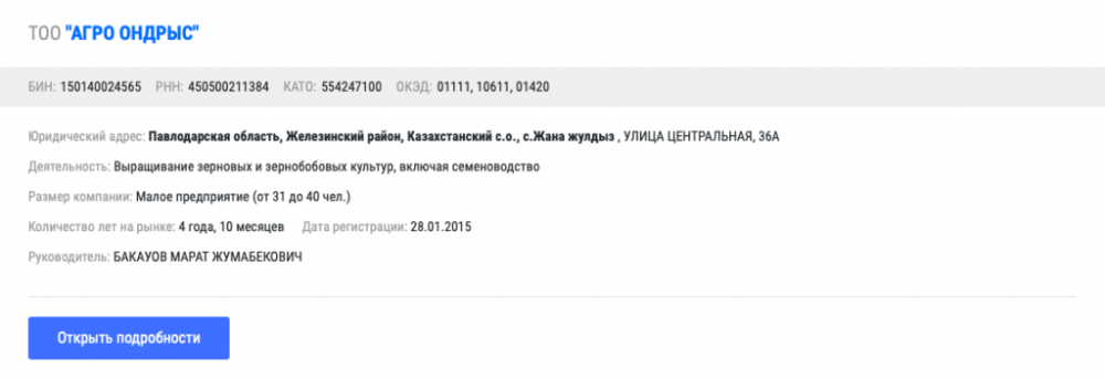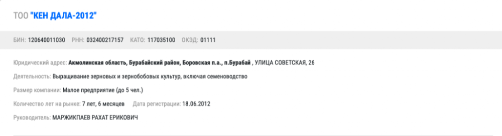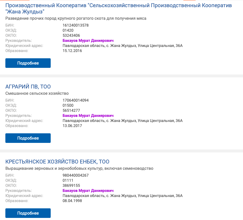 В Павлодарской области есть сразу несколько компаний, где руководителями числятся однофамильцы Булата Бакауова. Все компании задействованы в сфере сельского хозяйства. Даже на имя самого акима области зарегистрировано частное предприятие.