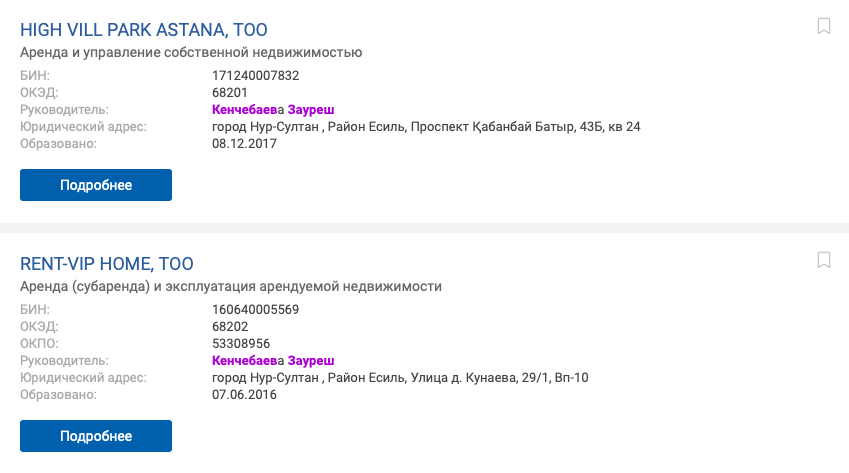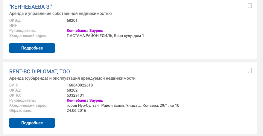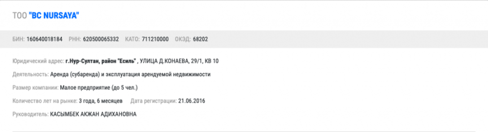 Имя матери Жениса Касымбека фигурирует в качестве руководителя сразу четырех компаний в сфере недвижимости в Нур-Султане.