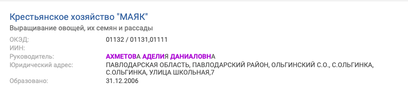 На дочери Даниала Ахметова зарегистрировано крестьянское хозяйство "Маяк" в Павлодарской области.