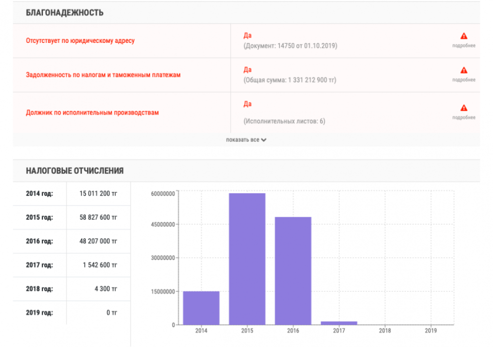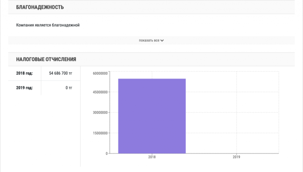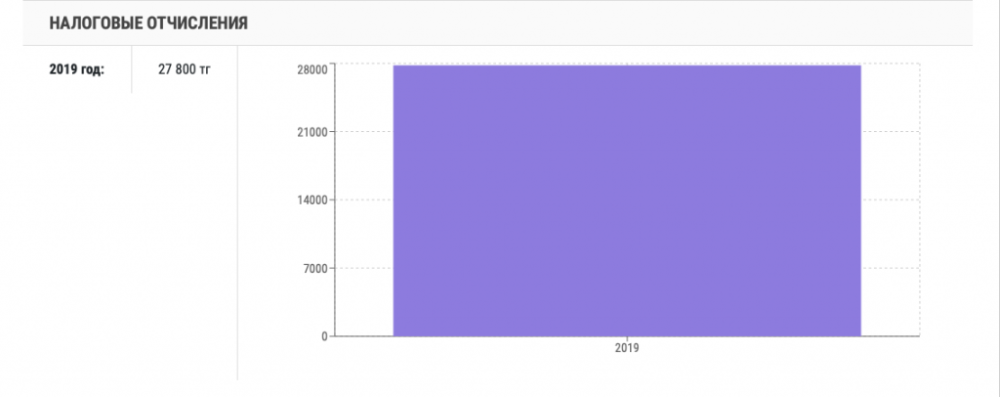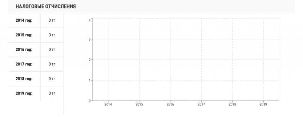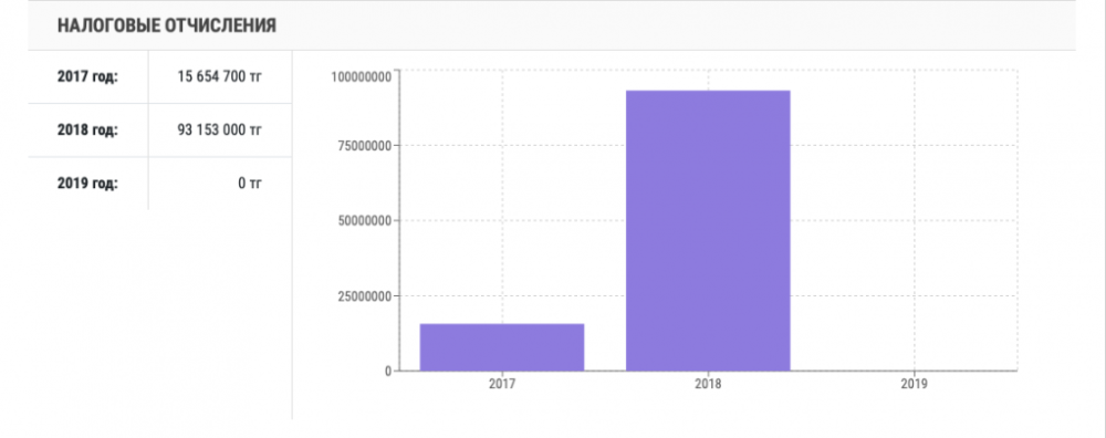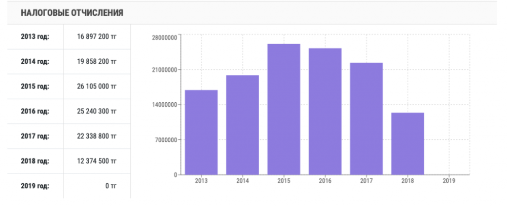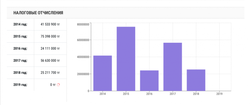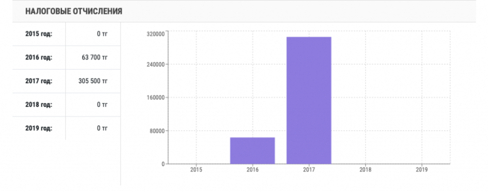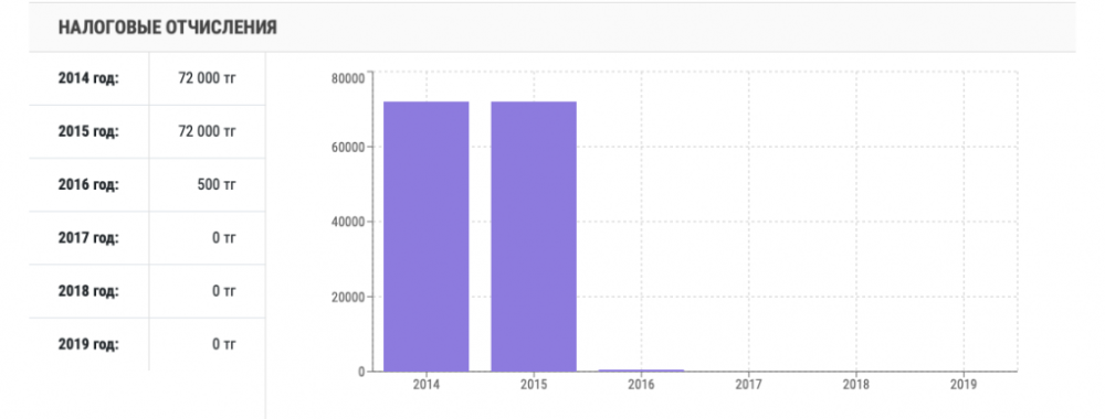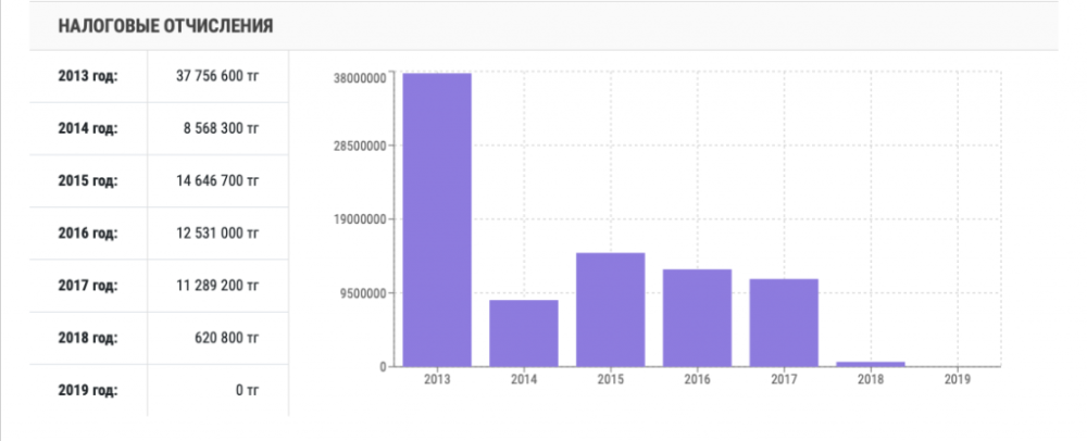 Со дня основания компании прошло 15 лет, однако налоговые отчисления производились лишь в 2014, 2015, 2016 годах. В 2016 году в казну поступило лишь 500 тенге.