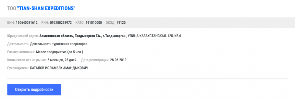 О компании с китайским названием "TIAN-SHAN EXPEDITIONS" известно, что она занимается туристской деятельностью. В отличие от старшей сестры, Исламбек Баталов сделал налоговые отчисления, хоть и небольшие.