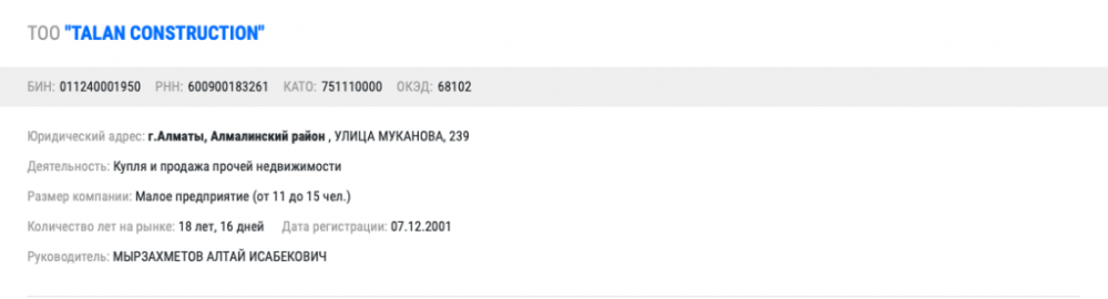 Еще одна компания под руководством Алтая Мырзахметова ТОО "TALAN CONSTRUCTION" известна как крупная строительная компания в стране.