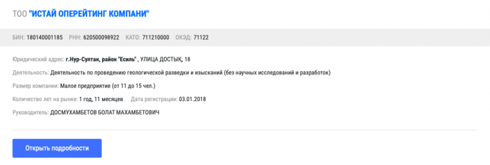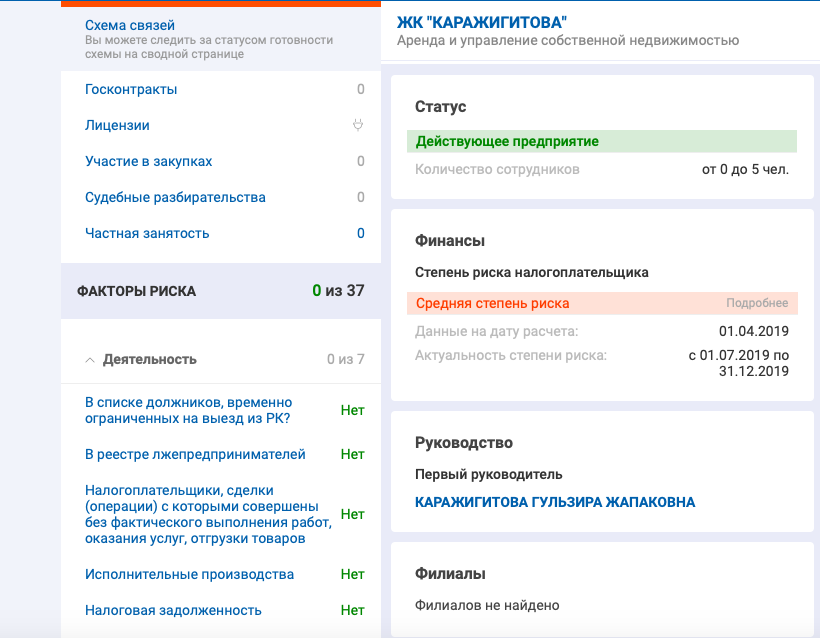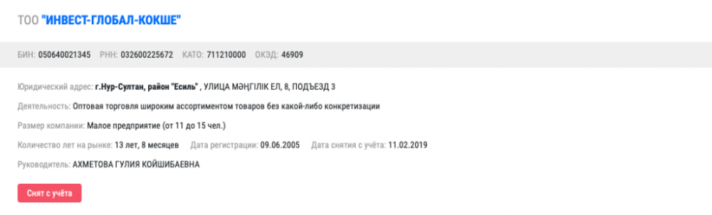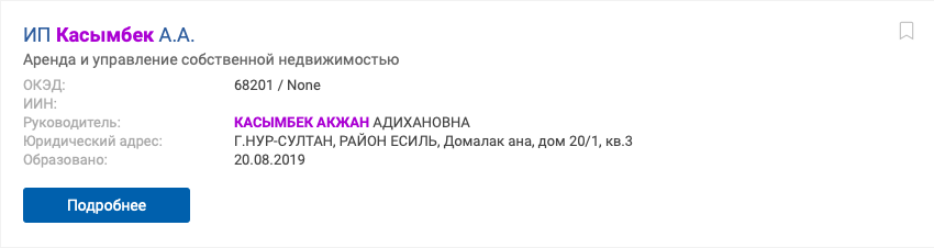 Супруга Жениса Касымбека исправно платит налоги за обе компании. В августе 2019 года она зарегистрировала ИП Касымбек А.А. для аренды и управления собственной недвижимостью в Нур-Султане.